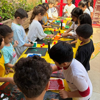 - A Turma Estrela, fez desenhos com tinta guache e pincel feito com elementos da natureza, com o objetivo de explorar diferentes materiais e formas de fazer arte.